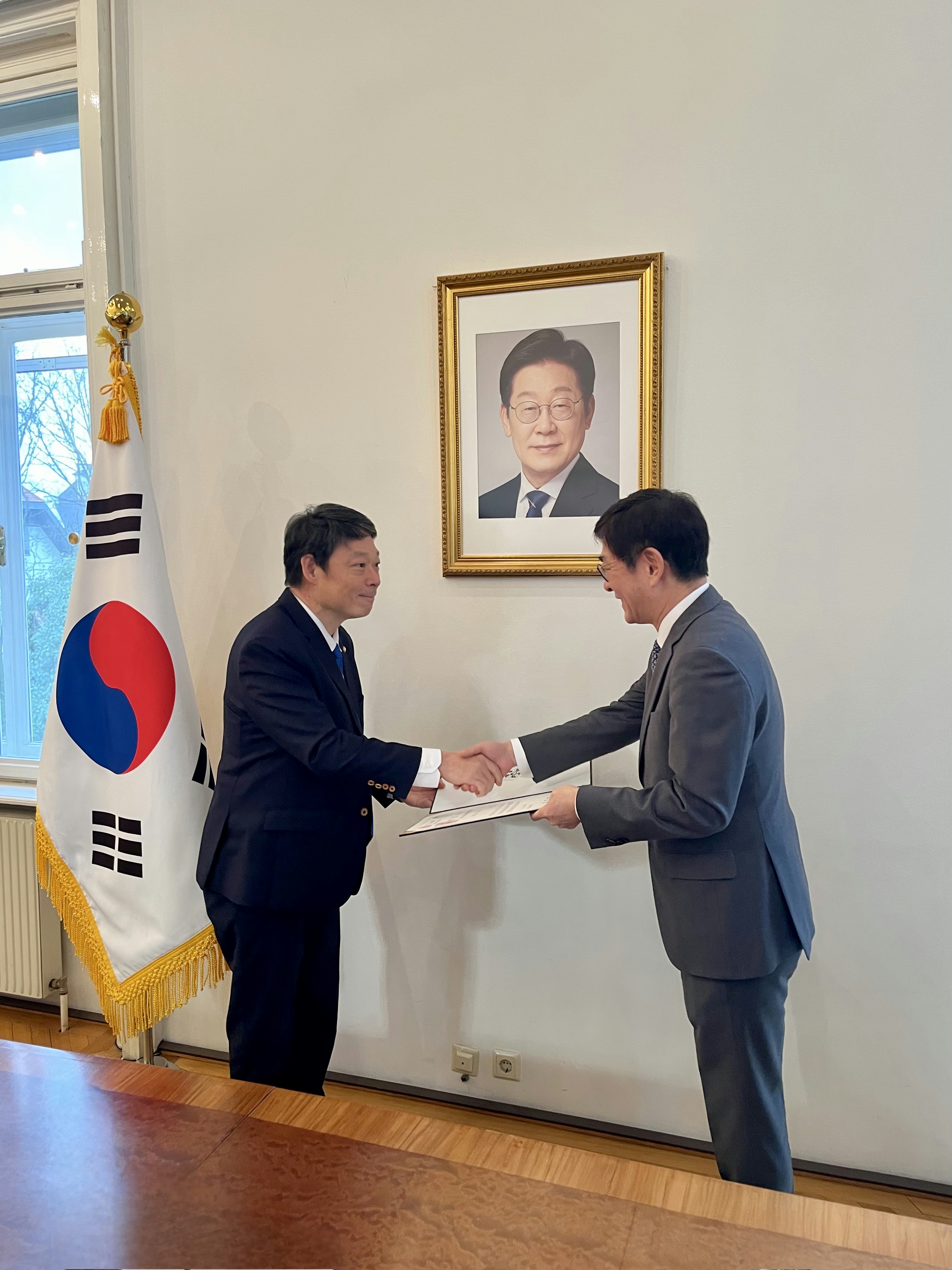 함상욱 대사는 2.5.(목) 민주평화통일자문회의 의장(대통령) 표창을 수상한 이호승 자문위원에게 표창장을 전수하였습니다.